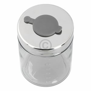 Transparenter Kunststoffbehälter mit Tassenskalierungen und silbergrauem Deckel mit Gummieinsatz. In dieser Kaffeedose können ca. 130 g gemahlenes Kaffeepulver untergebracht werden.