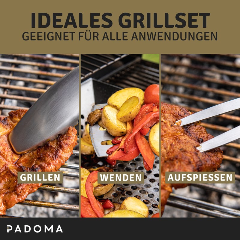 Sicherer Halt | Sicherlich kennst du es: Du grillst, es wird warm, deine Hände schwitzen und dir rutscht das Grillbesteck aus der Hand. Dank dem perforiertem Gummi fühlt sich der Griff bei dem PADOMA Grill Zubehör nicht nur komfortabel an, sondern gewährleistet ebenso einen sicheren Halt.