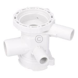 Dieser weiße Pumpenkopf ist an der Magnettechnik Laugenpumpe / Entleerungspumpe unten rechts in der Frontlader Waschmaschine angeschraubt. In dieses Gehäuse wird das Flusensieb eingeschraubt.