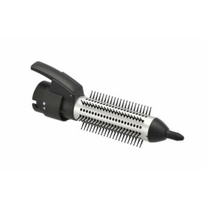 Grau/silberfarbene Lockenbürste mit einziehbaren Borsten.
